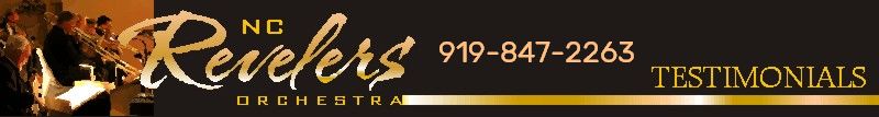 I have been actively involved in the Triangle Swing Scene since 2000. I have seen some good bands and I have seen some that were quite awful. I can say without exaggeration that the NC Revelers are a GREAT band. They have a clean, tight sound and they really know how to send it. So if you are looking for a band to dance to or one to relax with, the NC Revelers are the band for you! Paul Cwik Garner, NC Hey Henry! Thank you and the rest of the NCRO for playing at our Charity Ball! The professional quality of the performance really added to the success of the overall event, and was extremely well-received by our guests. We really enjoyed the variety of the music that the orchestra played, from salsa to swing dancing to slow tunes, which both the younger guests and adults had a lot of fun dancing to. The vocalists also sounded amazing. Many of the guests came up to me afterwards to tell me how much they had enjoyed the band more than any previous year, and that this was the most fun they'd ever had dancing at Charity Ball. Thank you for also providing a sound man during breaks, it helped the night to run smoothly. Thank you so much for contributing to the success of this event! We really appreciate how much it improved everyone's experience at our Charity Ball. Lilly (School Charity Ball Organizer) Raleigh NC Wow! I feel sorry for anyone who did not go to the NC Revelers gig yesterday. It was fantastic. The vocalists were superb. Thanks for bringing them here. I hope you have a spring concert in mind. Thomas H. Wilson NC Gentlemen of the NC Revelers Orchestra, I write to convey a huge thank you for your excellent performance at the Fike Auditorium in December. Your high performance standards displayed throughout the concert were very impressive, and the song selection varied enough to please anyone! Bravo and well done to all the band members! My family and I enjoyed the concert immensely and look forward to the Orchestra’s return to Wilson. Karen N. Wilson NC "We had fun with the band in Wilson. There was music for all ages YOUNG and OLD.. Listen to the music, clap your hands, get up and dance, dance, dance, or just relax to the music." M. Jones Henry, we just wanted to drop a note thanking you for the bands great contribution to our party last month. I thought the mix and quality of songs were excellent. Both vocalists were high quality. All of our guests were complimentary about the band's performance and thought the music added significantly to their enjoyment of the evening. We would love to have you back anytime and felt lucky to have found your blossoming group. We have become big fans and wish you the best in all your future endeavors . David (private event client) All who were present will confirm that it was an event not to be missed... I was no more prepared than anyone else there for the outstanding quality of the N.C. Revelers! I have heard jazz and swing ensembles all over the world. I have not heard better anywhere! The concert was absolutely UPTOWN! Solo vocalist Lauren Meehan is more than a beautiful girl with a beautiful voice; she is an expert jazz stylist - complete with skill in the elusive art of "scat". Her "Over the Rainbow" was absolutely exquisite Ken (Church Event client) ABOUT US | SCHEDULE| HISTORY | NEWS | LINKS | TESTIMONIALS THE MUSICIANS OUR MUSIC| | LISTEN | | BOOK THE BAND! GALLERY| CONTACT US | RESOURCES| JOIN US PLANNING YOUR EVENT | WEDDING RECEPTIONS| CONVENTIONS | CONCERTS| FUND RAISERS Contents Copyright © 2008 by NC REVELERS ORCHESTRA |