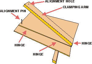 You may also want to drill a hole in the end of the clamping arm opposite the hinged end. Drill this hole straight down so that it goes completely throuh the clamping arm and into the base of the jig. Insert a finishing nail or dowel into this hole. Now when you bring the arm down it will be possible to attain the same alignment each time.