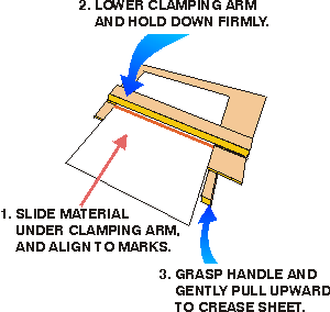 Now comes the home stretch! Here’s where all those marking come into play. Take the marked and cut material and slide in under the clamping arm of your new Bending Brake. Hold or clamp firmly with a C-clamp to prevent sliding. Align the marks with the outside edge of the clamping arm. Grasp the handle and pull upward gently but firmly. This creates a permanent fold line in your material. Put folds in all 17 bases.